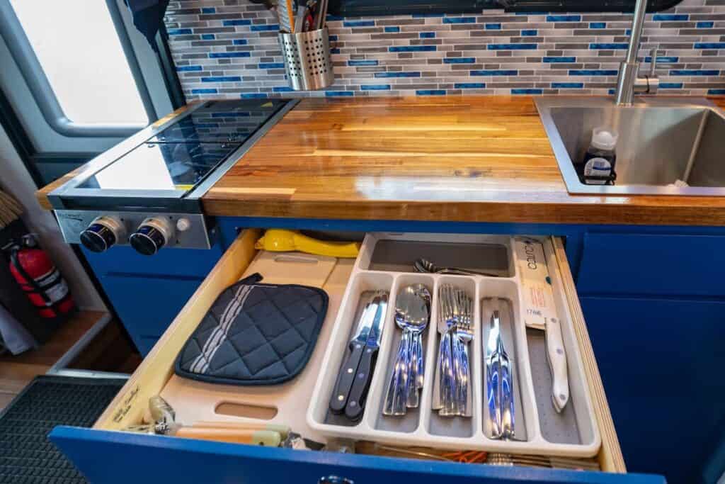 Stepping inside feels less like entering a van and more like walking into a luxury mountain loft. The interior is a masterclass in craftsmanship, featuring premium Baltic birch cabinetry—tougher and sleeker than standard plywood—and stunning acacia butcher-block countertops.