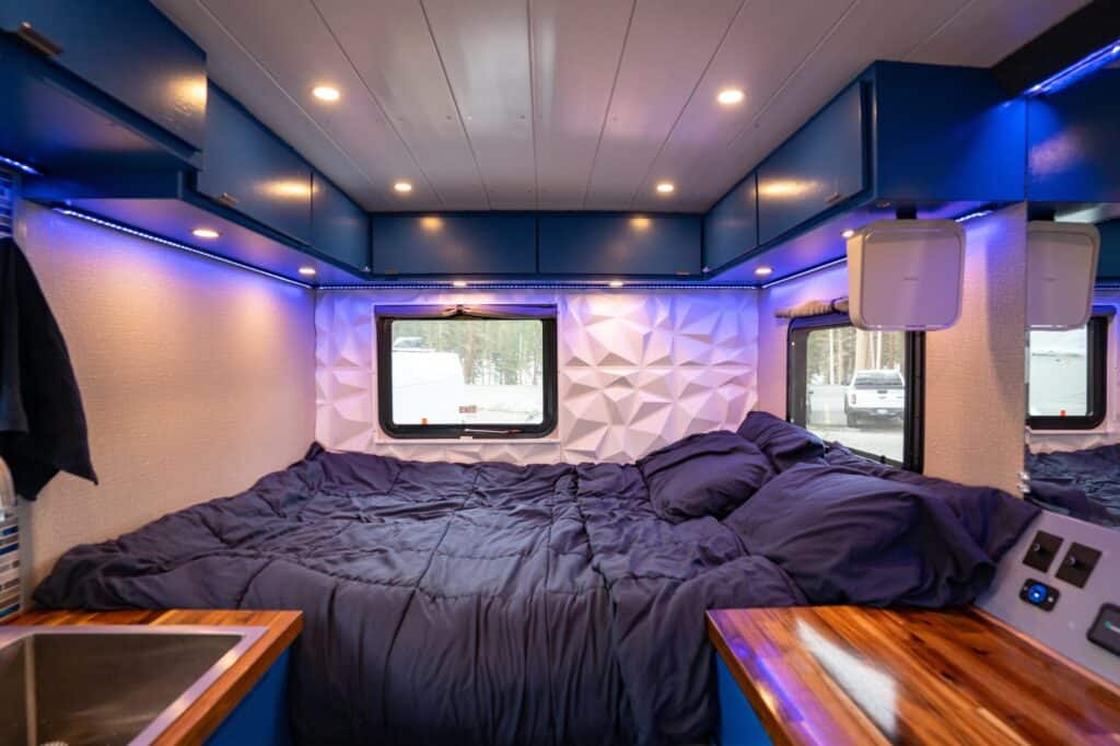 Being off-grid doesn’t mean being disconnected. This rig is a tech-lover’s dream, featuring a 72-inch projector screen for epic movie nights on the mountain. Thanks to the roof-mounted Starlink, you can handle remote work from the middle of a snowdrift at the adjustable fold-out table that stows flat against the wall when you’re off the clock.