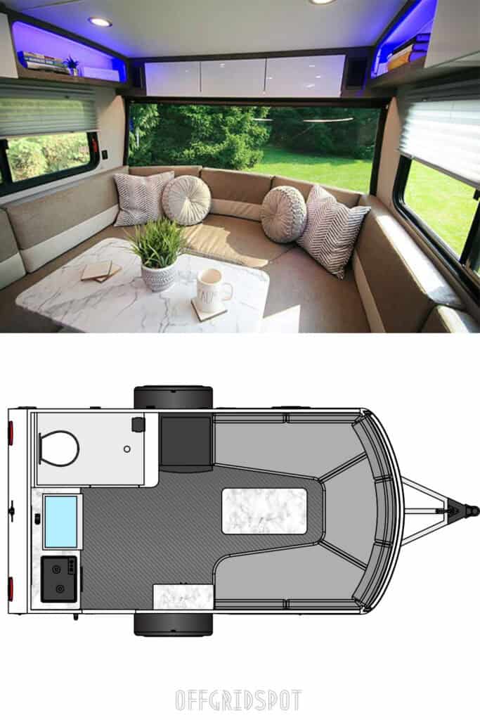 The back panel of this travel trailer pops open and stays that way, to create an additional roofed lounging area, or a window through which to stargaze. Many interior design options allow you to customize your travel trailer as you see fit.